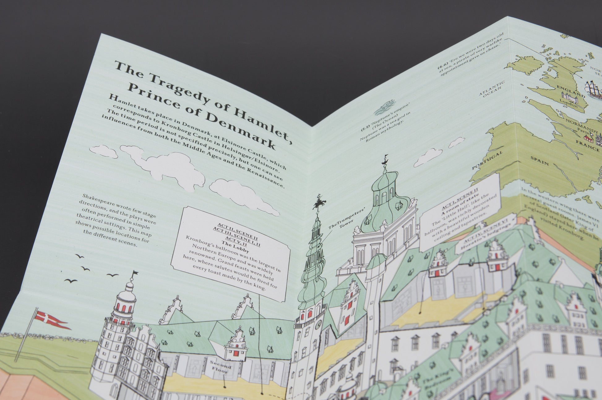 Follow us to Kronborg, the real-life model for Hamlet’s castle in Denmark, shown here as it looked when the play was written. This richly illustrated map presents the castle and its surroundings with every scene marked. See the battlement where the ghost of Hamlet’s father first appears, explore the great hall where the players may have performed or find the graveyard where Hamlet holds Yorick’s skull.